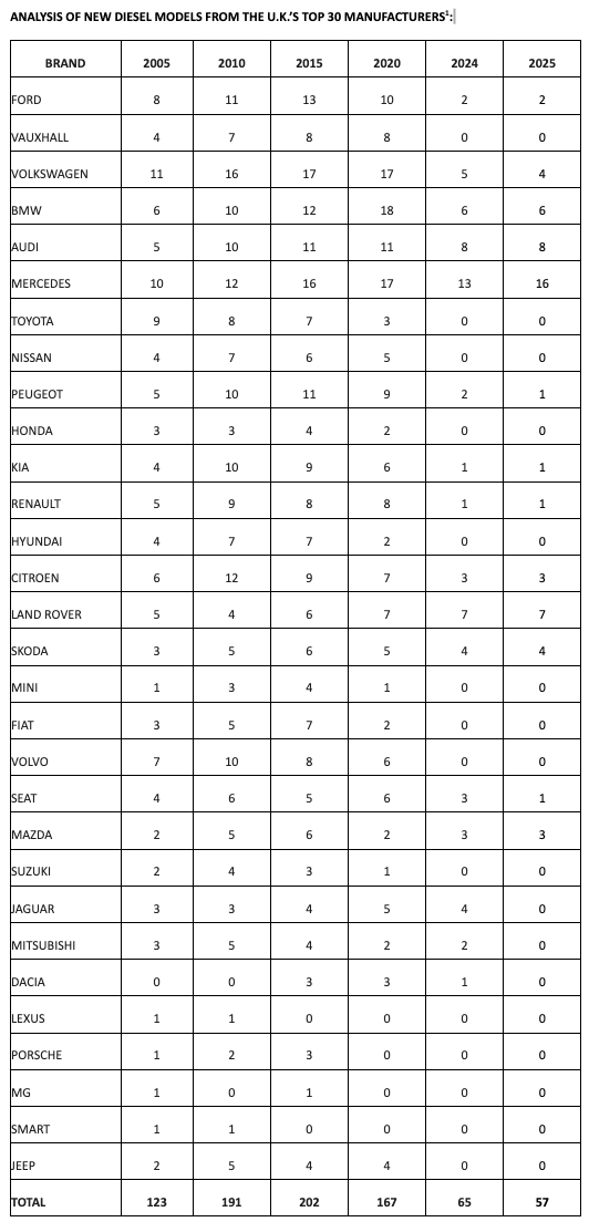 - Mercedes-Benz leads the market with 16 diesel models, up from 13 last year